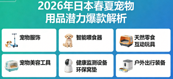2026年春夏,针对日本宠物市场,以下8款产品具备成为潜力爆款的可能性。首先,宠物冰垫作为夏季降温必备产品,其核心卖点在于“冰感凝胶”材质、多场景适用(室内、户外、露营)以及不同体型的尺寸细分。可折叠宠物泳池及兼顾宠物与儿童使用的喷泉垫,因兼具消暑与娱乐功能,在社交平台上热度较高。宠物户外随行杯是户外遛狗和露营的必备产品,强调安全材质、大容量以及附带喂食托盘。遛狗鞋可防止地面高温烫伤,核心特性为透气、防滑及反光设计。高架宠物床的架高设计可防潮、防虫并提升散热效果,适用于室内外。一次性尿垫及猫砂属...